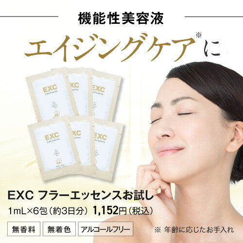 ブランド名EXC商品名 / 内容 EXC フラーエッセンス/お試しセット(1mL×6包)特徴APPS(アプレシエ®)高配合のEXCシリーズは、大名町スキンクリニックが独自に開発したクリニック限定の化粧品です。