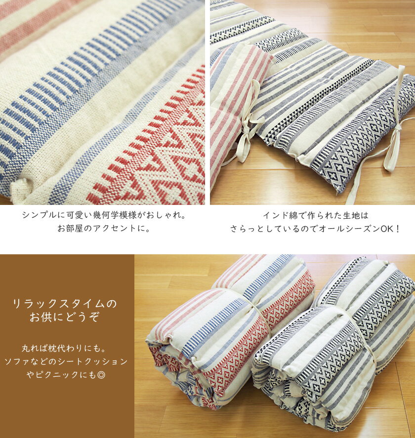 ロングクッション クッション インド綿 テラ コットン100% 幾何学柄 キリム柄 可愛い おしゃれ レッド/ブラック アウトドア キャンプ レジャー マット シンプル カーシート 車内クッションシート